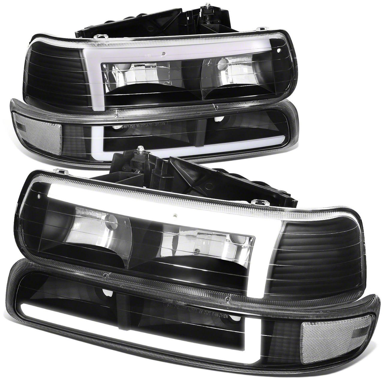 Construction and Appearance. Each headlight is housed in a sleek matte black finish that adds an aggressive yet refined touch to your vehicle’s exterior. The clear transparent lens and clear corner design provide optimal light dispersion and a clean, contemporary look. Built from high-quality materials, these headlights are made to withstand road debris, weather conditions, and daily wear.