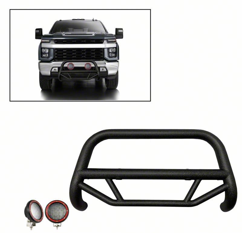 Protection. The front end of your Silverado 2500 HD is further protected by this Max T Bull Bar, which guards against small collisions, road debris, and obstructions encountered when off-roading. The integrity of essential front-end components must be preserved by this additional line of protection.