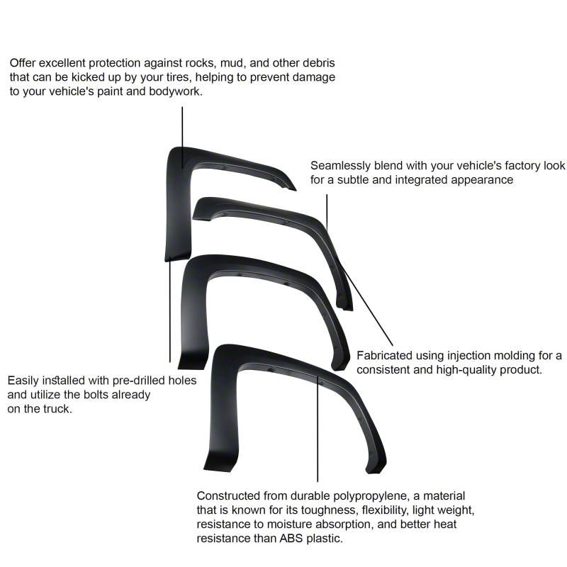 Construction and Appearance. Built from high-quality polypropylene, these fender flares are lightweight, impact-resistant, and offer better heat resistance than standard ABS plastic. Injection molded for a precise and consistent fit, they provide a seamless, OEM-style look that blends perfectly with your truck's body lines. Their moisture-resistant design ensures long-lasting performance in all climates.