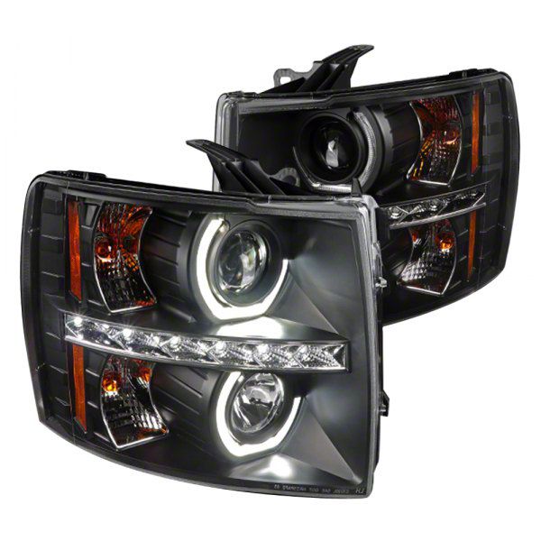 Bright Sporty Look. Flash a new look for your Silverado with this Dual U-Ring Halo Projector Headlights; Matte Black Housing; Clear Lens. Compatible with your vehicle's stock bulbs and factory mounting location, it is a quick upgrade for style and lighting.