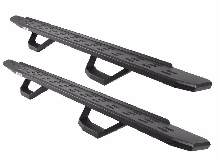 Inspired by the Ford Raptor design, the Go Rhino RB30 Drop Step Running Boards offer an aggressive, stylish upgrade to your ride! These cab length running boards will weather impacts and corrosion with their zinc plated galvanized 16-gauge steel construction. The RB30 drop step running boards come with your choice of protective bedliner style coating or textured black powder coat finish. These running boards provide a wide 7" stepping surface that runs most of the length and tapers towards the ends with flow-through slots that prevent the build up of dirt, ice, mud and snow. Included with the running boards are 4" drop steps that easily bolt on and will come in either a single or two pairs depending on your vehicle application. Finished with stylish angles, a boxed end design, and weight rating of up to 600 lbs per side, these running boards will stand firm to the elements and give your vehicle a look that will stand out from the rest.