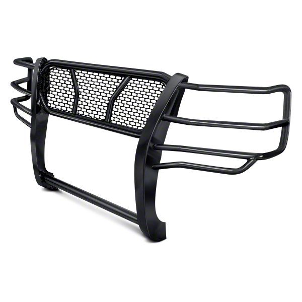 All Black and Tough. Using this Rugged Heavy Duty Grille Guard ensures that your truck is well-protected by a high-quality grille guard with heavy-duty 16-gauge steel construction. The custom-punched center grille offers additional protection while maintaining efficient airflow. Moreover, the entire assembly is covered in a semi-gloss black powder coat for extra durability and provides an appealingly tough look to your Silverado’s rugged exterior.