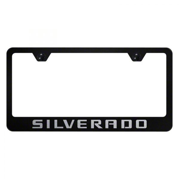 Exceptional License Plate Frame. This Black Silverado License Plate Frame adds an impressive quality to the rugged good looks of your Silverado 2500. It features the Silverado logo with eye-catching details that are guaranteed to make heads turn no matter where you take your vehicle. And with its rugged design and construction, this license plate frame is set to withstand brutal driving conditions for years to come.