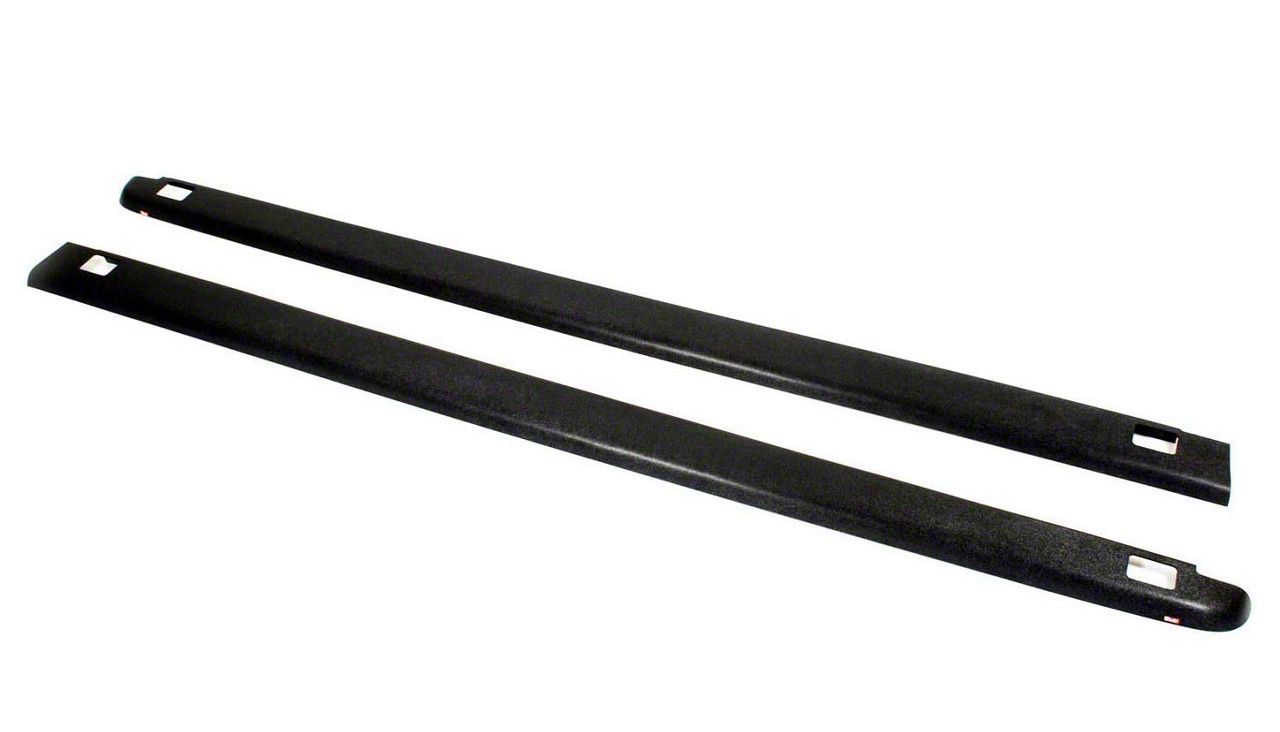 Installation. This truck bed side rail protector uses 3M tape to be installed. Please read these instructions before installation. Before removing red backing from tape, trial fit the bedcap. Take note of proper fit and center the stake pocket holes (if applicable). Apply pressure to top of bed cap to insure that all tape is properly seated. The adhesive requires 48 hours to fully cure. Avoid getting the vehicle wet until 48 hours after installation.