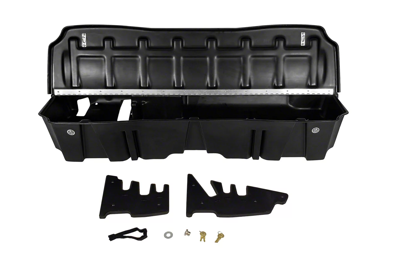 Installation. The Underseat Storage with Lockable Lid; Black Fits under the rear seat with no tools required; it utilizes existing space and secures with simple fasteners or might just sit in place depending on the design.