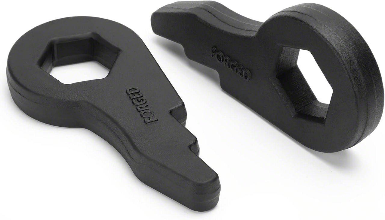 This torsion key lift kit features a black powder-coated surface finish that provides excellent resistance to corrosion. It offers 1"–3" of lift and is made of high-strength forged carbon steel, delivering twice the strength of the factory system. Designed for convenience, it requires no modifications or drilling, and can be installed in about 2–4 hours. The kit allows you to level your vehicle by adjusting the lift to match the difference between front and rear heights, or maintain a stock appearance by applying the same lift amount to both ends. For a true level lift, simply use the front lift amount equal to the difference in stock heights and apply it to the rear. Professional installation is highly recommended.