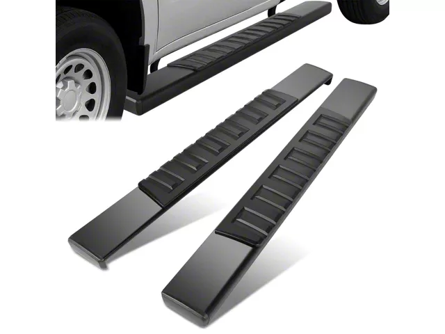 Construction and Appearance. Manufactured from durable aluminum, these running boards are designed for long-lasting rust resistance. They feature a sleek black powder-coat finish and raised textured step pads to improve traction and stability.