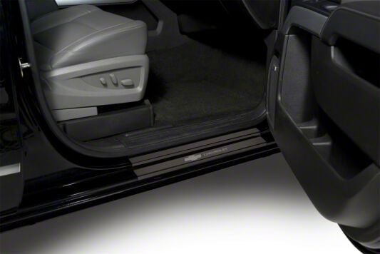 Description. Door Sill Plate Set; Cargo Door Sill Protector Set; Black Platinum; 4 pc.; w/Chevrolet Logo