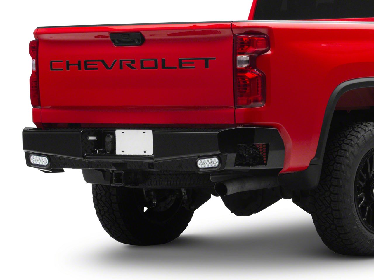 Flush Mount Lighting. Engineered to enhance your road safety, this stellar design boasts 2, flush mount LED license plate lights. Proudly made in the USA, this bumper also comes with 2 standard LED back up lights and sensor cutouts.