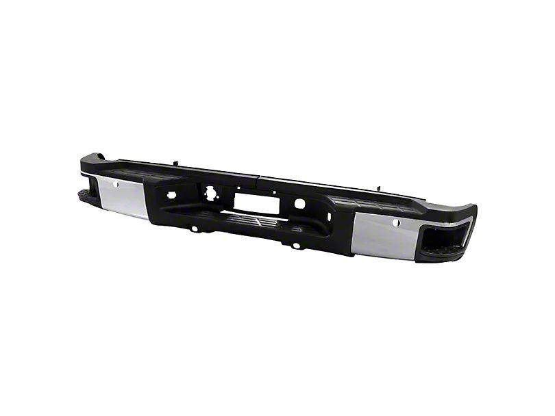 Functional and Stylish Rear Bumper. This rear bumper is engineered to provide a blend of style, durability, and functionality for your Chevrolet Silverado 3500 HD. Featuring a full-width design and a combination of black and chrome finishes, this bumper enhances the look of your truck while providing robust rear-end protection.