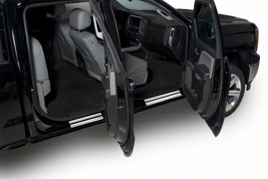 Construction and Appearance. Crafted from high-quality T-304 stainless steel, these door sills are built to withstand the rigors of daily use while maintaining a lustrous polished finish. The meticulous construction process guarantees durability and resistance to corrosion, ensuring that they remain a standout feature on your Sierra for years to come.