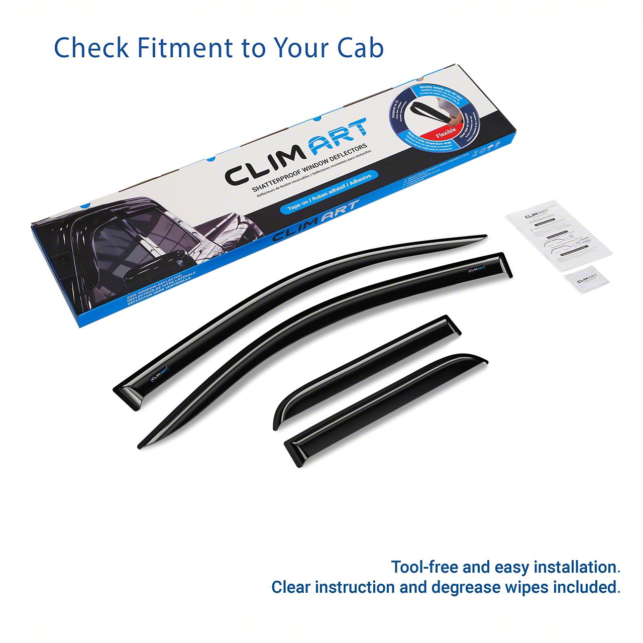 Love to keep the windows open but the noisy wind, rain & snow make driving around in your car an awful experience? Presenting CLIM ART car window shields that are specially designed to deflect rain, wind, sunshine, and snow to make car rides a more enjoyable experience for you and your family. CLIM ART CAR WINDOW GUARDS -Keeping windows open while driving on high-speeds is a daunting task as the wind and rains can cause discomfort to the passengers inside. -The special streamlined design of the window shields deflects environmental elements away by altering the vehicle's aerodynamical wind flow pattern. -Allows fresh air to circulate into the car preventing the need for air conditioning and thereby saving fuel. -Tape-style outside mounting (door & above the windows) with 3M tape for a stronghold. -Comes in a dark color for added sun protection while also adding to the appearance of your precious car. The stickable logo comes in the package and is not attached to the product. The user can choose to stick it or not. -Window rain guards are car wash friendly. -Package includes 2 front deflectors, 2 rear deflectors, installation instruction, mounting kit and degrease wipes. Compatible with - Chevrolet 2014-2018 Silverado 1500 Double Cab, 2015-2017 Silverado 2500 Double Cab,- 2015-2019 Silverado 2500HD Double Cab,- 2015-2018 Silverado 3500HD Double Cab,- GMC Sierra 2014-2018 1500 Double Cab,- 2015-2018 Sierra 2500HD,3500HD Double Cab WE OFFER A 100% SATISFACTION GUARANTEE! Should our product fail to please you, we will either replace the product or offer you a full refund, with no questions asked.So, why think twice? ORDER NOW & Get our Window Rain Guards Right Away!