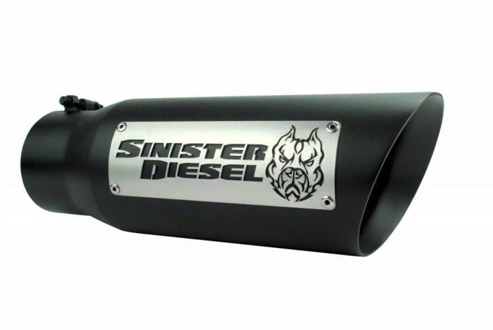 Give your Ford Super Duty Powerstroke, Dodge Ram Cummins, or Chevy Silverado/GMC Sierra Duramax or any vehicle equipped with a 4" exhaust tail pipe. Give your truck a bold look with the Sinister Diesel Dual Wall Exhaust Tip featuring an angle cut. We make every Sinister Diesel dual wall exhaust tip from corrosion-resistant stainless steel for durability and long life. This dual wall 4" to 5" diesel exhaust tip fits any 4" tailpipe and gives you a larger 5" outlet with a angle cut edge. This diesel exhaust tip is also protected with a high-quality black ceramic coating that hides unsightly soot and truck a clean and powerful look. We give each exhaust tip a finishing touch with an eye grabbing riveted on Sinister Diesel logo on the side.Features:4-inch inlet, 5-inch outlet, 15-inch length15" LengthMade from black ceramic coated Stainless SteelDual Wall constructionSimple 1-step clamp-on installation (no welding required)Universal Fit1 Year WarrantyCustomer Notice – Exhaust Tip PolicyWe want you to love your Sinister Diesel exhaust tip. To ensure the best experience, please note:All sales are final once installed.Due to the nature of exhaust components, this product cannot be returned for credit after installation. Please double-check the fitment before installation to ensure it meets your needs.If you have any questions before installing, our team is happy to help. Contact us anytime for support.Thank you for choosing Sinister DieselFrequently Bought Together