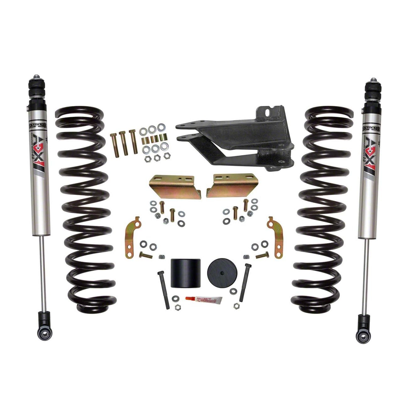 Engineered for improved handling and for proper front-end alignment, this system integrates smoothly and functions perfectly. Raising your Super Duty's suspension clearance makes room to run larger, more aggressive 33-inch tires. Skyjacker specifically engineered a 2-Stage Dual Rate Softride® coil springs to provide the right rate and soft ride for your Diesel engine.Skyjacker’s legendary Softride® technology engineered processes achieve maximum wheel travel, ride quality and extends the long-lasting life of this variable rate coil spring. The process starts with 5160H chromium alloy material, a presetting process and advanced method of shot peening. Compressing the spring completely down to where the coils touch (solid height) is preset. This takes any fatigue or stress off the spring and eliminates sagging.An ultra heavy-duty track bar relocation bracket captures the front crossmember on both sides to prevent movement in this critical high-stress area and to keep the axle centered.The sway bar lowering brackets realign the front sway bar working angle to achieve maximum sway control. Drop spacers reposition the front bump stops. Front brake line extension brackets correctly reposition the brake lines. Shocks are a key link in-between the chassis and your suspension. Their key role is to dampen out or control the terrain to keep your tires in contact with the terrain.Front damper capacity enhanced with ADX M2.0 Adventure Series Aluminum Monotube Shocks. ADX M2.0 has a race-inspired full-displaced valving system. Nitrogen charged with Internal Floating Piston Technology = Quickest Shock Reaction Time Ever. Straightforward installation with detailed step-by-step guide.