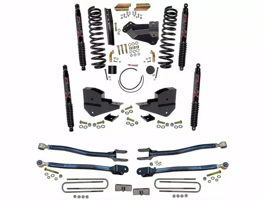 SkyJacker 4-Inch 4-Link Suspension Lift Kit with Rear Lift Blocks and Black MAX Shocks (23-26 4WD 6.8L, 7.3L F-250 Super Duty w/o 4-Inch Axles, Factory LED Headlights, Onboard Scales)Find parts that fit my vehicle