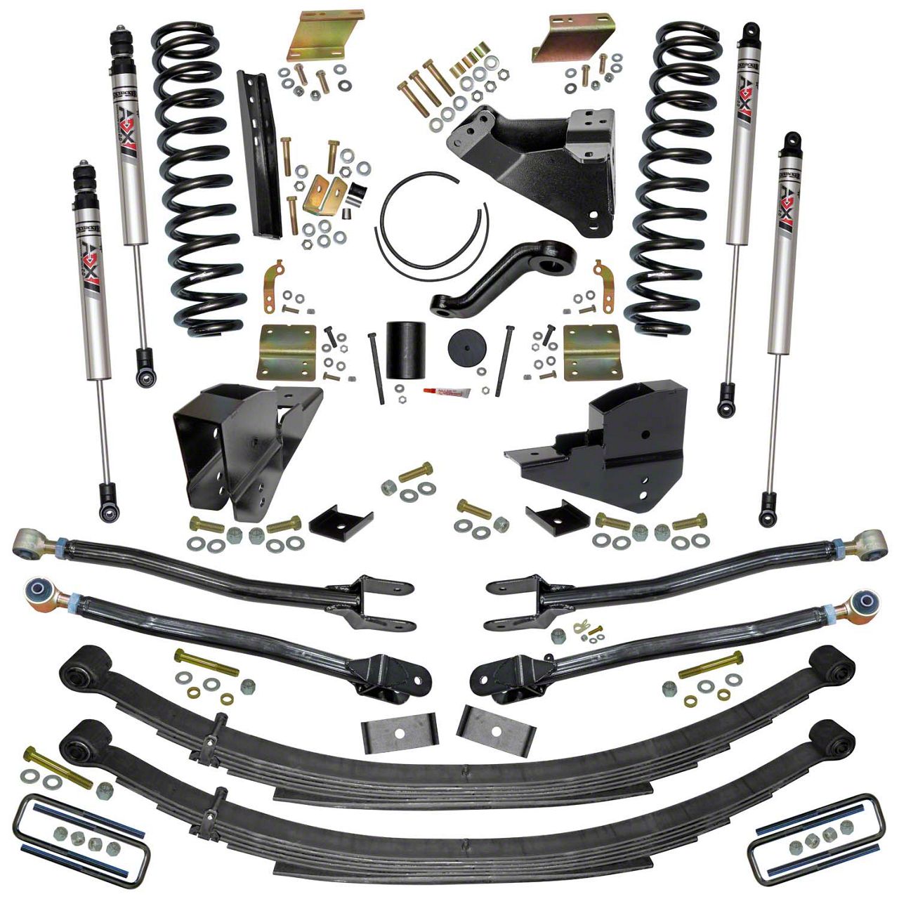 Skyjacker re-engineered the Super Duty's suspension via an impressive 4-Link Conversion. Replace your OEM radius arms with integrated radius arm drop brackets plus upper and lower adjustable control arms. Formed from 2-inch OD x 0.188 wall DOM tubing, both pairs of control arms are adjustable Flex Links. The adjustability allows proper caster settings to improve handling. Flex Links have a forked clevis end at the lower axle mount. The upper bracket mount has 1-1/4” forged rod end with Rubber Encased bushing.Skyjacker’s legendary Softride® technology engineered processes achieve maximum wheel travel, ride quality and extends the long-lasting life of the coil spring. Skyjacker specifically engineered this Variable Rate Coil Spring for the F250 4WD Diesel to deliver a smoother ride.An ultra heavy-duty track bar relocation bracket captures the front crossmember on both sides to prevent movement in this critical high-stress area and to keep the axle centered. The sway bar lowering brackets realign the front sway bar working angle to achieve maximum sway control. Drop spacers reposition the front bump stops. Front brake line extension brackets correctly reposition the brake lines. A heavy-duty steering stabilizer relocation bracket corrects and enforces the stabilizer connection.Skyjacker Softride® leaf springs are individually shot-peened with hard steel pellets at very high velocities. Softride® springs also have tapered leafs to distribute loads more evenly and to create more flex at the leaf ends. Teflon® wear pads between leafs and bolt style spring clips prevent binding and eliminate friction. Shocks are a key link in-between the chassis and your suspension. Front and rear damper capacity enhanced with ADX M2.0 Adventure Series Aluminum Monotube Shocks. ADX M2.0 has a race-inspired full-displaced valving system. Nitrogen charged with Internal Floating Piston Technology = Quickest Shock Reaction Time Ever.Together this complete kit improves handling with incredible ride quality. Reap the benefits: On-Road Refinement and Off-Road Readiness.