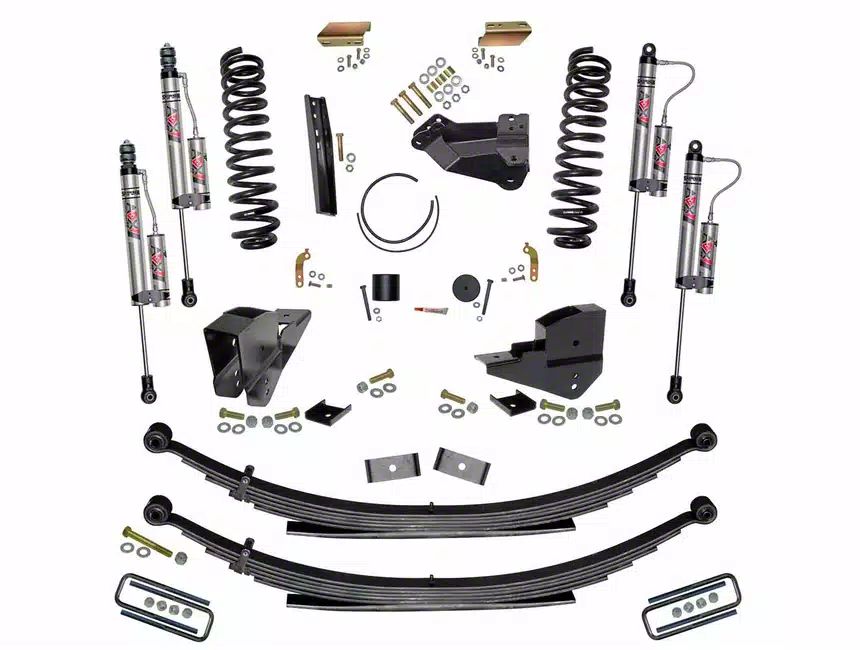 Ultimate Lift and Performance. The SkyJacker 6-Inch Suspension Lift Kit with Rear Leaf Springs and ADX 2.0 Remote Reservoir Monotube Shocks elevates your vehicle by 6 inches, significantly improving off-road performance and ground clearance. This lift kit allows for the installation of larger tires, enhancing your 4WD F-250 Super Duty's capability to tackle tough terrains.