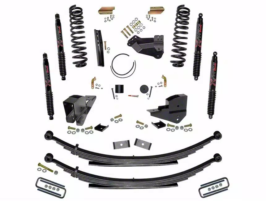 Advanced Suspension Lift Kit. The SkyJacker 4-Inch Suspension Lift Kit with Rear Leaf Springs and Black MAX Shocks offer significant improvements in off-road capabilities and vehicle handling. Specifically engineered for 2023-2026 4WD 6.7L Powerstroke Ford F-350 Super Duty SRW models without 4-inch axles, factory LED headlights, and onboard scales, this lift kit ensures a perfect fit and enhanced performance.