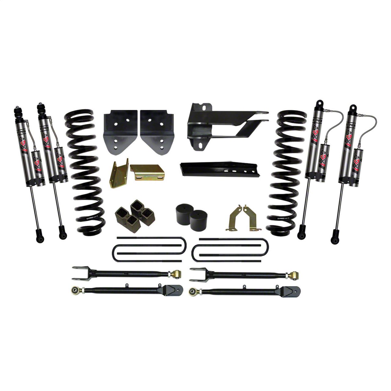 Description. Raise your Super Duty's suspension clearance with essential room to run 35-inch tires. Those larger aggressive off-road tires will gain you ground clearance and add a larger ready-for-action stance. With Skyjacker’s all-in lift kit, you can reap the benefits of On-Road Refinement and Off-Road Readiness.Formed from 2-inch OD x 0.250 wall DOM tubing, both pairs of control arms are adjustable Flex Links. The adjustability allows proper caster settings to improve handling. Flex Links have a forked clevis end at the lower axle mount. The upper bracket mount has 1-1/4” forged rod end with RB style rubber bushing.Skyjacker’s legendary Softride® technology engineered processes achieve maximum wheel travel, ride quality and extends the long-lasting life of the coil spring. Skyjacker specifically engineered this Variable Rate Coil Spring for the F350 Super Duty 4WD Diesel to deliver a smoother ride.Radius arm drop brackets lower the OEM radius arm mounts at the frame to maintain the correct caster specifications for proper alignment. An ultra heavy-duty track bar relocation bracket captures the front crossmember on both sides to prevent movement in this critical high-stress area and to keep the axle centered.The sway bar lowering brackets realign the front sway bar working angle to achieve maximum sway control. Drop spacers reposition the front bump stops. Front brake line extension brackets correctly reposition the brake lines. A heavy-duty steering stabilizer relocation bracket corrects and enforces the stabilizer connection.A 2-inch rear block and U-bolt kit delivers a more level stance. Shocks are a key link in-between the chassis and your suspension. Front and rear damper capacity enhanced with ADX 2.0 Adventure Series Remote Reservoir Aluminum Monotube Shocks. ADX 2.0 has a race-inspired full-displaced valving system. Nitrogen charged with Internal Floating Piston Technology = Quickest Shock Reaction Time Ever.Together this complete kit maintains the factory geometry angles, alignment specifications and structural strength. Straightforward installation with step-by-step guide. Reap the benefits: On-Road Refinement and Off-Road Readiness.