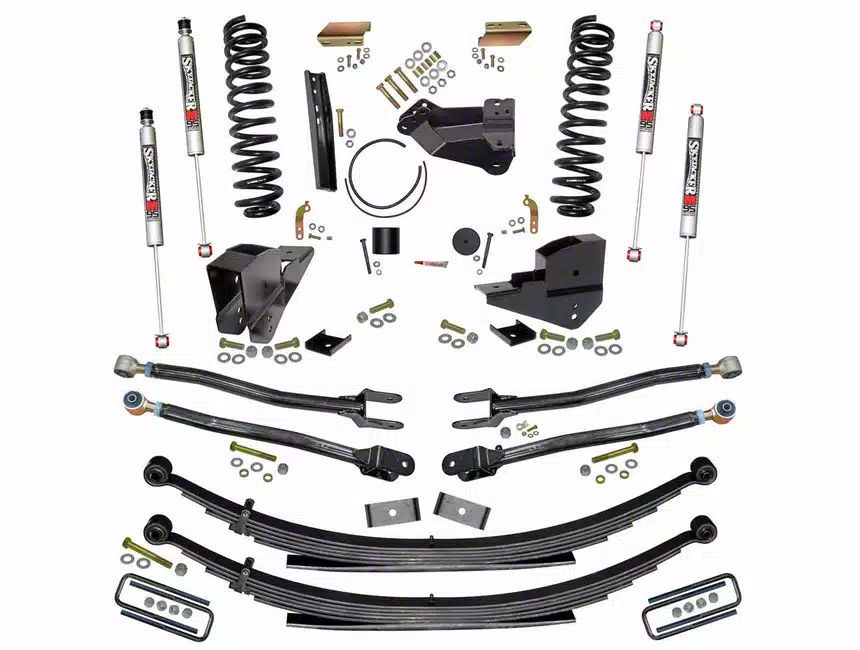 Advanced Suspension Upgrade. The SkyJacker 6-Inch 4-Link Suspension Lift Kit with Rear Leaf Springs and M95 Performance Shocks enhances your vehicle's handling and stability by providing proper caster settings. This lift kit features Skyjacker Softride Technology, which maximizes wheel travel and ride quality, ensuring a smoother ride. The inclusion of variable-rate coil springs further improves comfort and performance.
