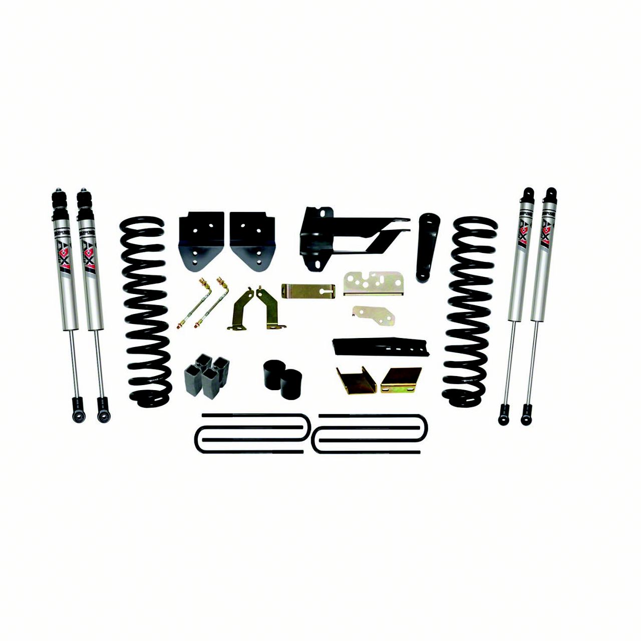 Take your F350 to a higher level of off-road status with 37's. With Skyjacker’s all-in lift kit, you can reap the benefits of On-Road Refinement and Off-Road Readiness.Skyjacker’s legendary Softride® technology engineered processes achieve maximum wheel travel, ride quality and extends the long-lasting life of the coil spring. Radius arm drop brackets lower the OEM radius arm mounts at the frame to maintain the correct caster specifications for proper alignment. An ultra heavy-duty track bar relocation bracket captures the front crossmember on both sides to prevent movement in this critical high-stress area and to keep the axle centered. A drop pitman corrects steering angle.The sway bar lowering brackets realign the front sway bar working angle to achieve maximum sway control. Drop spacers reposition the front bump stops. Front brake line extension brackets correctly reposition the brake lines. A heavy-duty steering stabilizer relocation bracket corrects and enforces the stabilizer connection.A 4.5-inch rear block and U-bolt kit delivers a more level stance. E-brake relocation brackets, bump stop spacers, rear braided stainless steel brake line extensions and rear exhaust hanger brackets are included.Shocks are a key link in-between the chassis and your suspension. Front and rear damper capacity enhanced with ADX M2.0 Adventure Series Aluminum Monotube Shocks. ADX M2.0 has a race-inspired full-displaced valving system. Nitrogen charged with Internal Floating Piston Technology = Quickest Shock Reaction Time Ever.Together this complete kit maintains the factory geometry angles, alignment specifications and structural strength. Reap the benefits: On-Road Refinement and Off-Road Readiness.