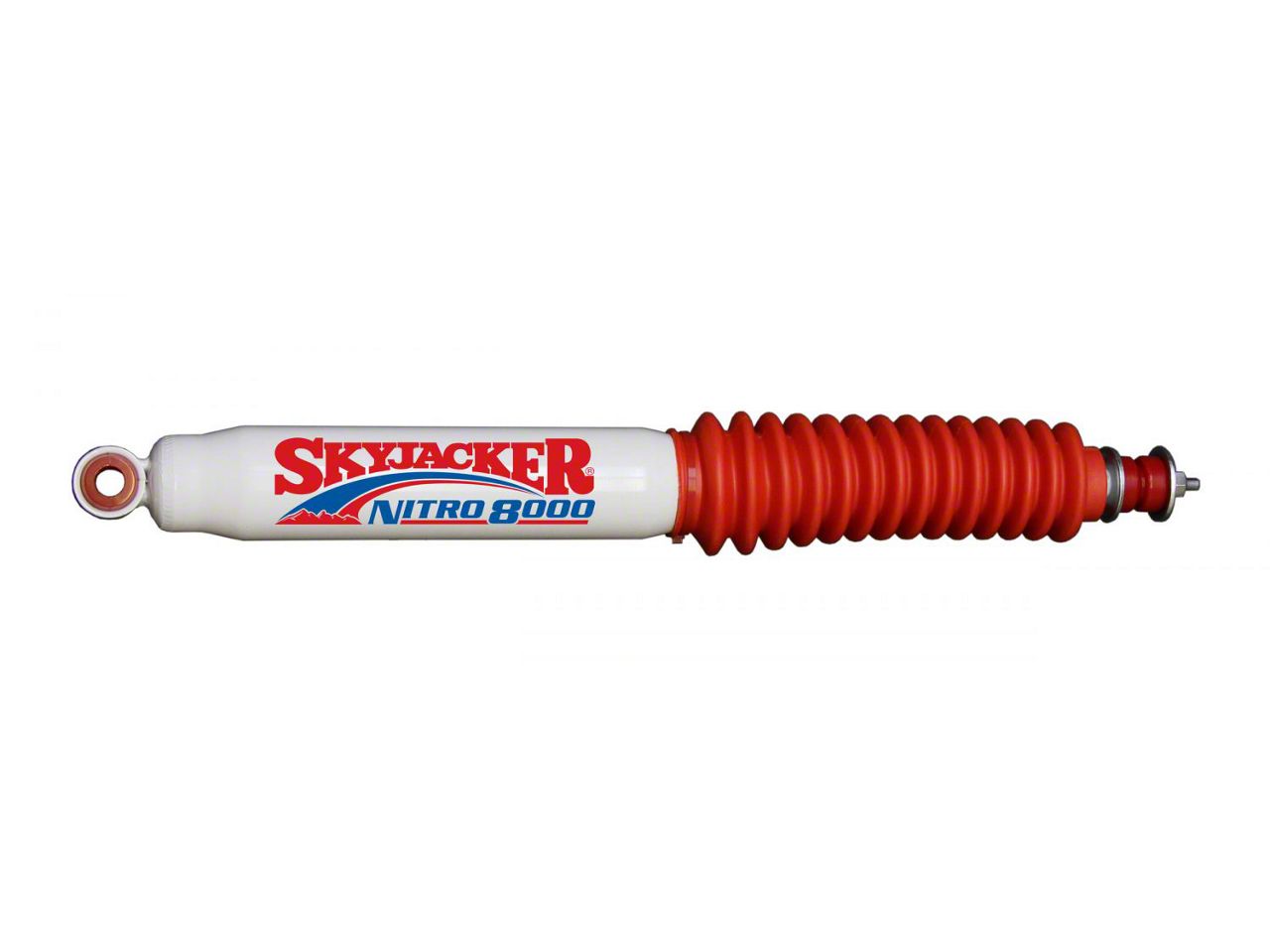 Serious Construction. Skyjacker doesn't put their name on just any shock. The Nitro 8000 features high-performance design points like a bonded iron piston, chromed rod, and polyurethane bushings. It dissipates heat under use to prevent fade. Also, thanks to the white painted body, snazzy decals, and red accordion boot, you'll love the way this shock looks under your ride.