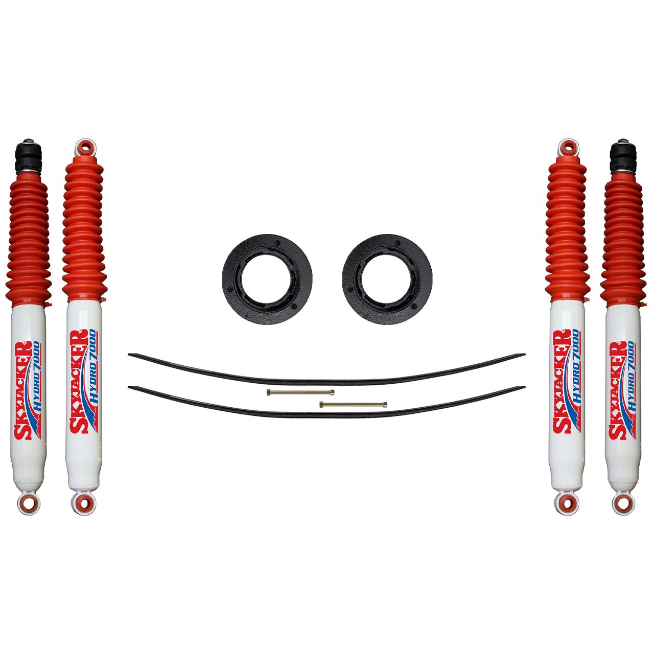 Construction and Durability. Featuring a combination of matte white, matte red, and matte black finishes, this lift kit includes durable hydro shocks and heavy-duty leaf springs for enhanced ride quality and handling. Built to withstand harsh terrain, this system ensures long-lasting durability and reliable suspension support.