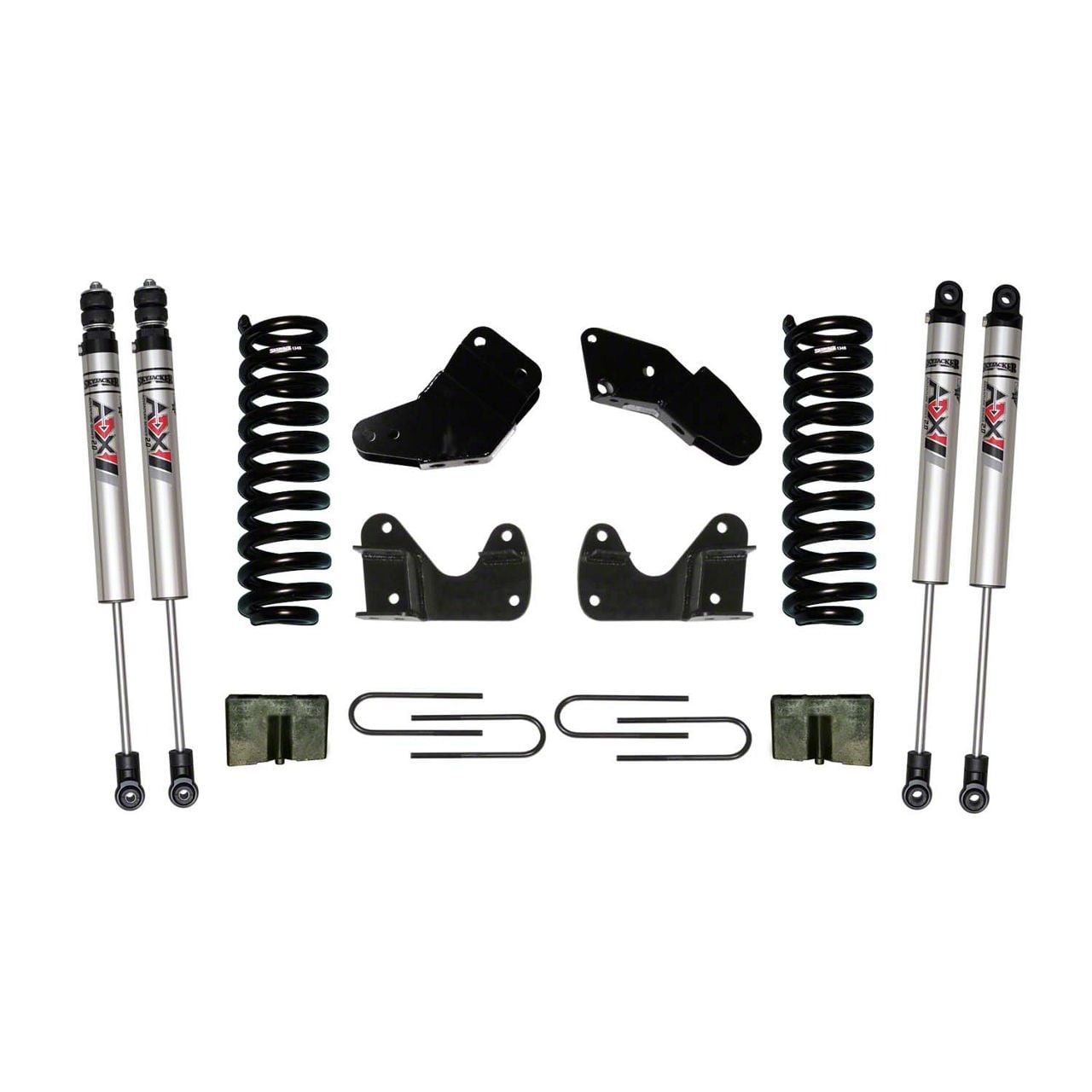 Raise your Ranger suspension clearance with essential room to run 32-inch tires. Those larger aggressive off-road tires will gain you ground clearance and add a larger ready-for-action stance.Skyjacker’s legendary Softride® technology engineered processes achieve maximum wheel travel, ride quality and extends the long-lasting life of the coil spring.Center Hinge drop brackets and Radius arm drop brackets lower the OEM axle and radius arm mounts to maintain the correct specifications for proper alignment.A 4.5-inch rear block and U-bolt kit delivers a more level stance. Shocks are a key link in-between the chassis and your suspension. Front and rear damper capacity enhanced with ADX M2.0 Adventure Series Aluminum Monotube Shocks. ADX M2.0 has a race-inspired full-displaced valving system. Nitrogen charged with Internal Floating Piston Technology = Quickest Shock Reaction Time Ever.Together this kit maintains the factory geometry angles, alignment specifications and structural strength. Straightforward installation with step-by-step guide. Reap the benefits: On-Road Refinement and Off-Road Readiness.