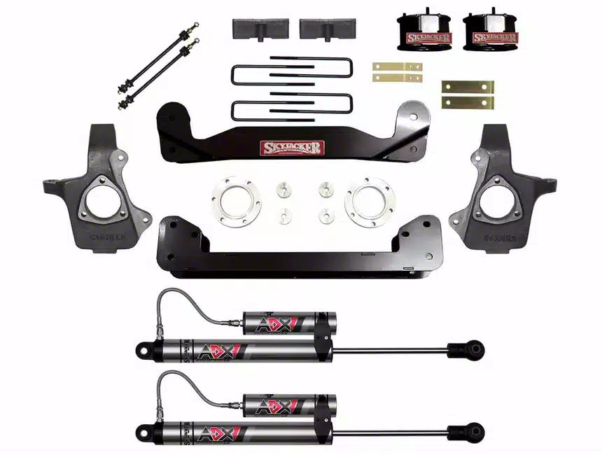 Application. The SkyJacker 4-Inch Suspension Lift Kit with ADX 2.0 Remote Reservoir Shocks fits 2014-2018 Sierra 1500 with Stock Cast Steel Control Arms.