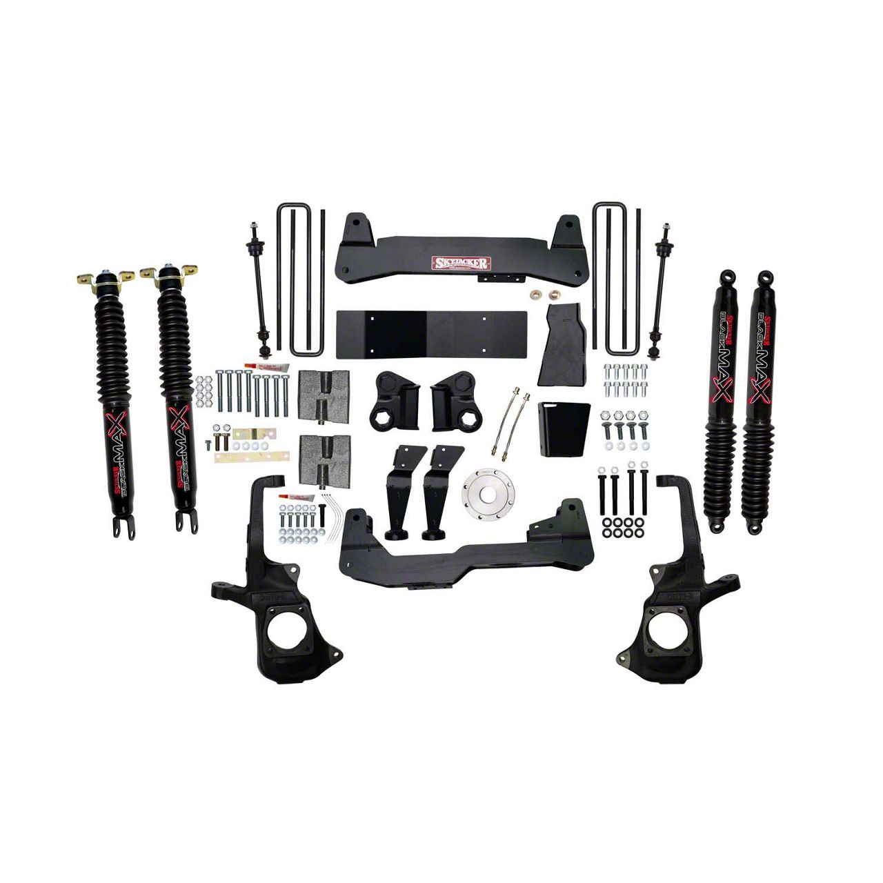 Skyjacker has designed a dependable suspension that reinforces and strengthens your heavy-duty beauty's capabilities. Raising the suspension clearance of your 2500HD, gives you room to run larger, more aggressive tires. Skyjacker’s design will unleashed exceptional performance with uncompromised strength. Increase ride height to run up to 35-inch tires. Exacting engineered CNC machined ductile iron replacement steering knuckles maintain proper steering geometry through the travel cycle. Knuckles preserve CV extension and prevent CV axle overextension within the OEM tolerances. Aligns to OEM specifications and works properly with Electric Stability Control (ESC) system. The pair of sturdy front and rear drop crossmembers provides a solid mounting point for the OEM lower control arms. A differential skid plate tie the two crossmembers together to create a rigid sub-frame and added protection for vital steering and driveline components. Two separate differential relocation brackets reposition and correct front CV axles and driveshaft angles.Skyjacker’s raised torsion bar brackets align and lock into each OEM lower control arm by aligning hex portion of bracket with hex torsion bar mount. This bracket design raises the front torsion bar mount up to parallel the OEM torsion bar crossmember mount. Raised torsion bar brackets delivers a clean look with exceptional high ground clearance.This system integrates smoothly and functions perfectly with OEM suspension. Includes everything necessary for a complete front and rear lift. This all-inclusive kit also has front bump stop brackets, front and rear brake lines, front sway bar links, cast ductile iron rear blocks with longer Grade 8 U-bolts and lock nuts. Front and rear damper capacity enhanced with Black MAX Shocks. Black MAX Shocks have specific valving and stroke for this application. Black MAX's Advanced Foam-Cell technology increases performance and style to deliver a smooth, comfortable ride. Black MAX Twin-Tube Foam-Cell Hydraulic Shock with Boot.Black MAX Engineered with Advanced Foam-Cell Technology.Black MAX Shock Has Vehicle Specific Multi-Stage Valving.CNC Machined Ductile Iron Knuckles. Knuckles Maintain OEM Steering Geometry. Front and Rear Crossmembers + Skid Plate = Rigid Sub-Frame. Two Separate Diff Brackets Reposition / Correct CV Angles. Raised Torsion Bar Brackets Align and Lock into OEM LCA. Precision Engineered to Maintain Proper Suspension Geometry. Works Properly with Electronic Stability Control (ESC) System. Unleashed Exceptional Performance. Uncompromised Strength.Modern Exacting CNC Laser Cut, Bends and Machining.
