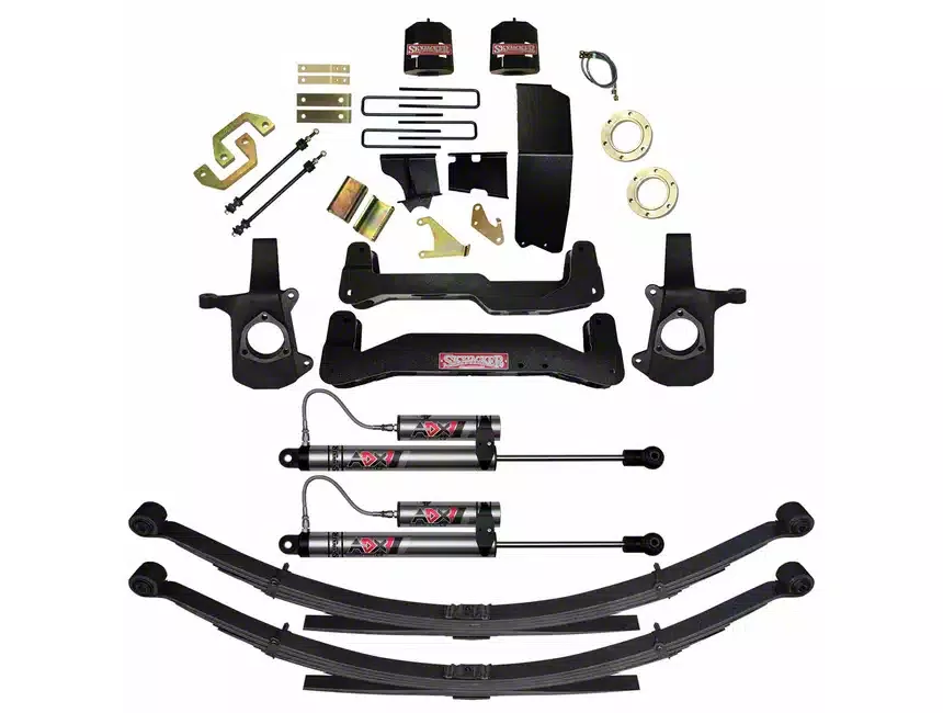 Significant Height Increase. Transform your Silverado 1500 into an off-road powerhouse with the SkyJacker 6 to 7-Inch Suspension Lift Kit with Leaf Spring and ADX 2.0 Remote Reservoir Shocks. This significant height boost not only enhances the truck's appearance but also increases ground clearance, allowing for larger tires and superior off-road capability. The kit includes high-quality leaf springs designed for consistent performance and durability. These springs ensure a smooth, stable ride, maintaining comfort even with the increased lift.