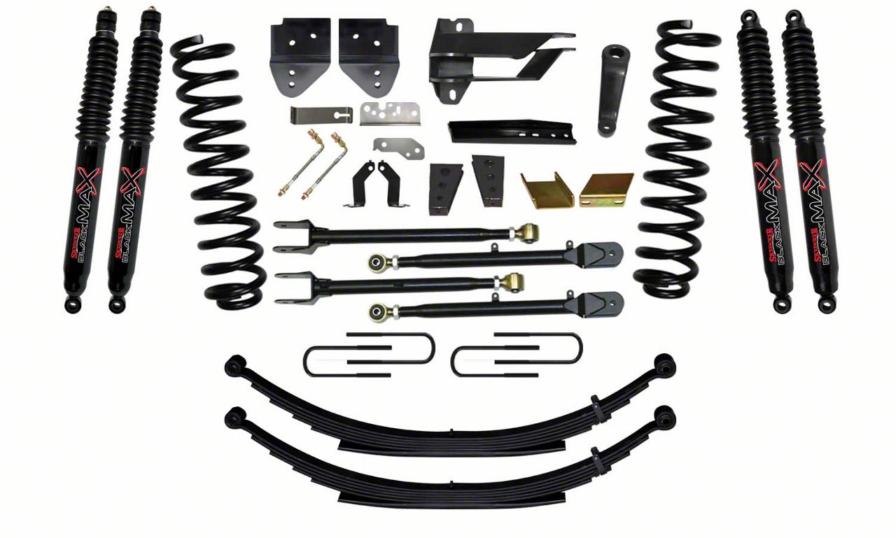 Bolder Off-Roading. Let your Ford Super Duty tackle the challenging terrains with confidence by using the SkyJacker 8.50-Inch Suspension Lift Kit with 4-Link Conversion and Black MAX Shocks. This system perfectly combines on-road driveability and off-road suspension flexibility. Installing this lift kit on your 4WD significantly improves your off-roading stance while providing smoother rides. Furthermore, it includes 4 Black MAX Shocks, front coil springs, rear leaf springs, 4-link assemblies, relocation brackets for the sway bars and track bar, steering stabilizer bracket, bump stop spacers, U-bolts, and rear lift blocks.
