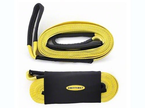 Durable Materials. Smittybilt accessories lead the way for off-road enthusiasts of all sorts. This Smittybilt 3-Inch x 30-foot. Recovery Tow Strap with a 30,000 Pound Rating provides reliable assistance should you, or your friend, become stuck in a literal rut on a day out. The strap is made from weather-resistant, brightly colored nylon webbing with double stitching and reinforced hoop ends, so it’s ready to rise to any challenge should you face.