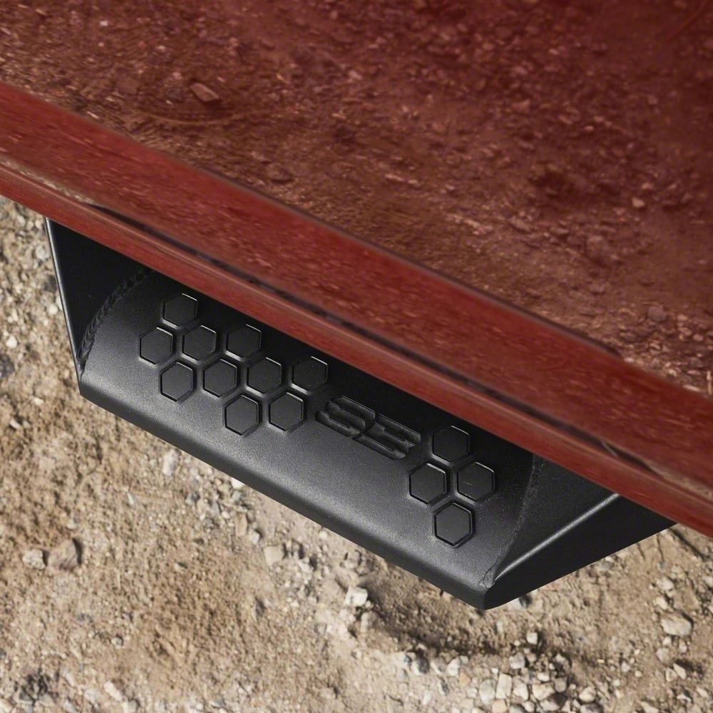 Construction and Appearance. Crafted from premium-grade steel, these side step bars are built to last. They feature a black textured powder-coated finish that offers excellent resistance to corrosion and rust, ensuring long-lasting durability. The welded end caps and slotted step pads provide extra protection and secure grip, while the angular design adds a rugged touch to the overall appearance of your F-350 Super Duty.