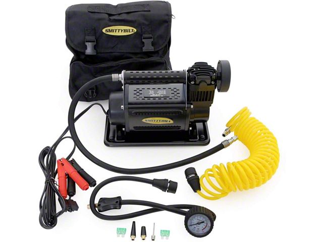 Convenient. Everything about Smittybilt's High Performance Air Compressor says convenience, including an easy-to-read pressure gauge, screw-on brass inflator top, reusable air filter, quick release 16-foot air hose, and 10-foot power cord. Smittybilt covers this compressor with a 1-year limited warranty.