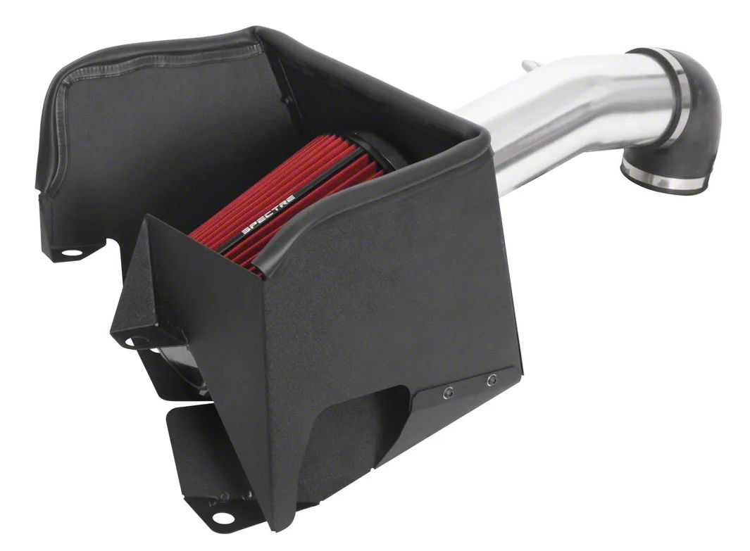 Comprised of High-Quality Components. This model of Spectre Performance’s cold air intake comes with a polished aluminum intake pipe, stainless steel clamps, and black, powder-coated heat shields. Thanks to these components, the system can endure the demands of high-performance applications and prevent engine heat from damaging the intake inlet.