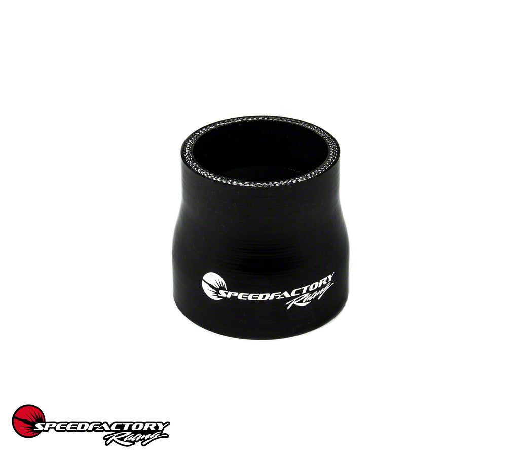 SpeedFactory is proud to offer our own line of silicone couplers. Our 4 ply Polyester reinforced silicone couplers have been made to survive serious boost applications. Manufactured to the SAE J20 specification and utilizing 4 plies of polyester, we can achieve a continuous temperature range up to +376 degrees F for direct turbo installations and have burst pressures up to over 200PSI. All of our hose products are made with a super slick outer cover with our logo printed on each coupler. All SpeedFactory couplers are produced in black color with white logo and have a slick outer coating to promote easy cleaning and sharp look. Specifications:*Wall Thickness: 4-Ply Polyester Reinforced *Temperature Rating: -76 degrees F to +376 degrees F *Material: Silicone *Hose Length: 3" *Type: Straight Transition