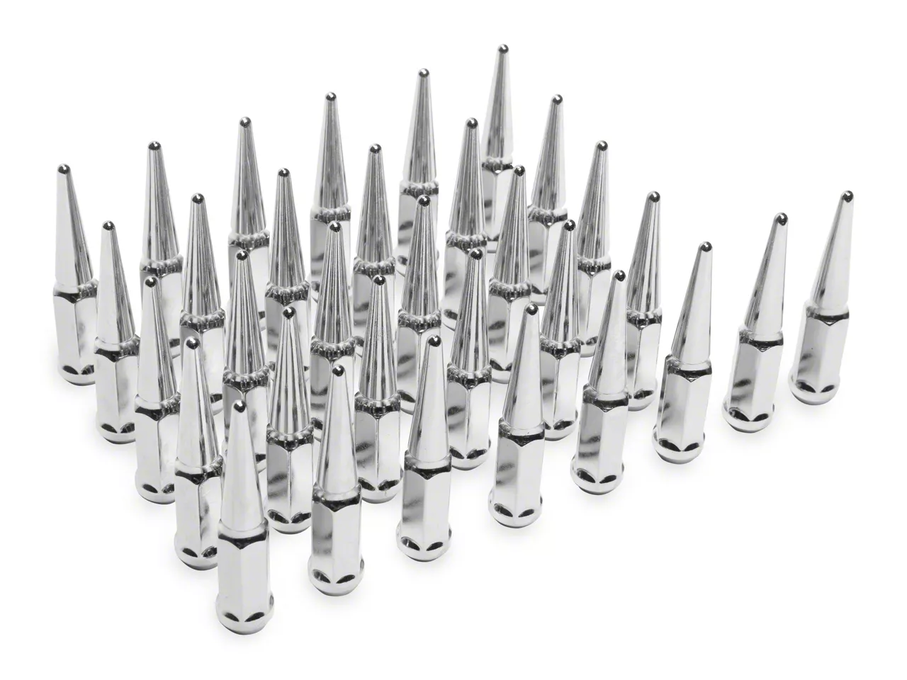 Application. This SpeedForm Chrome Spiked Lug Nut Kit; 14mm x 1.5; Set of 32 is designed to fit 2012-2026 RAM 2500 models. (2) Lug Nut Sockets are included.