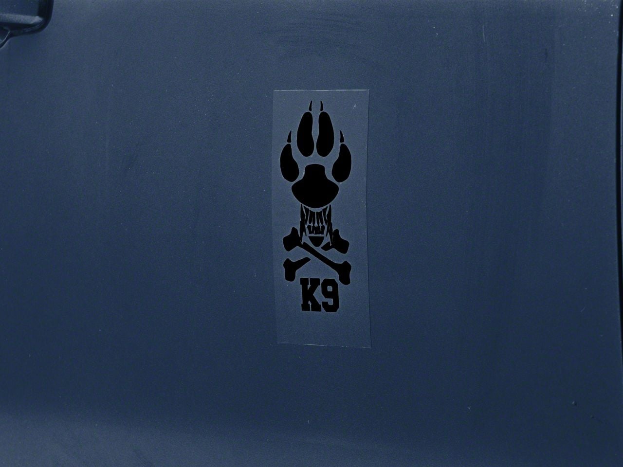 K9 Decal. Show your support for your furry friends in blue with this SEC10 K9 Novelty Decal. This decal features a very unique paw print, fang and cross bone design that will look great in your rear or side window.