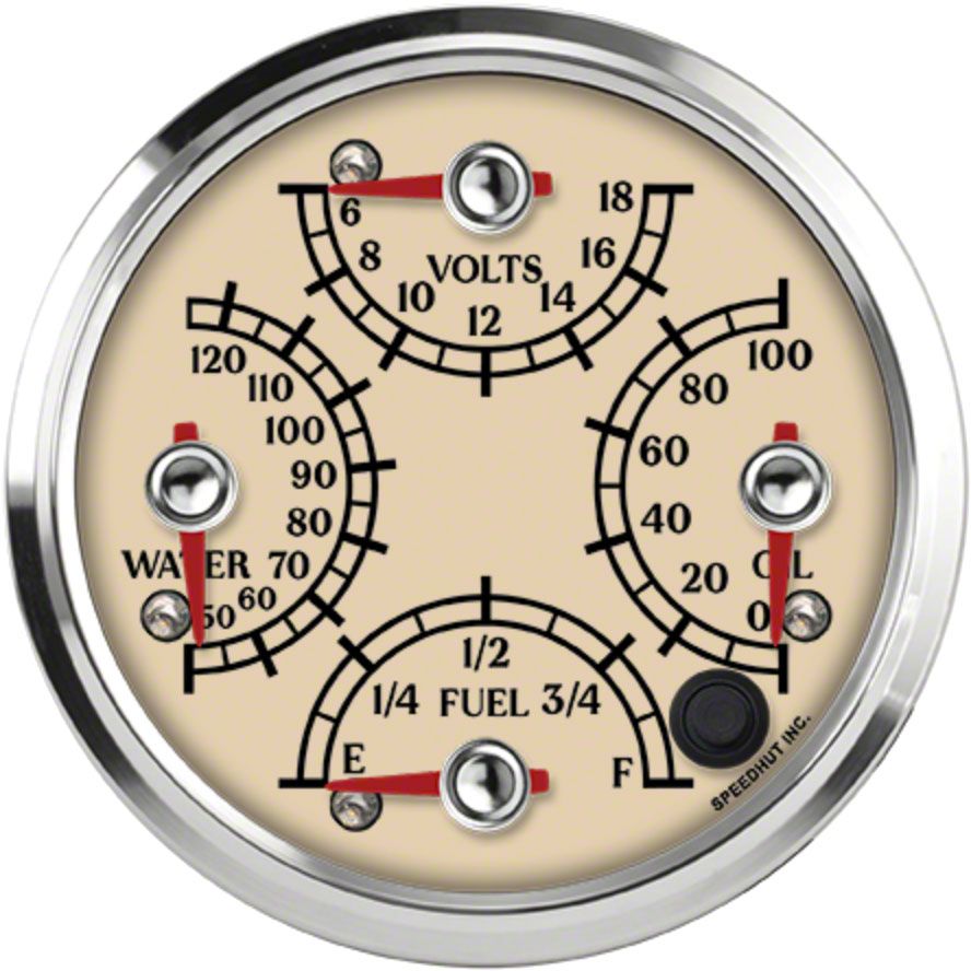 Speedhut Antique Series 4-Inch Quad Gauge; Fuel Level; Oil Pressure 0-100 PSI; 6-18 Volts; Water Temerature 50-125 Degrees Celcius (Universal; Some Adaptation May Be Required)