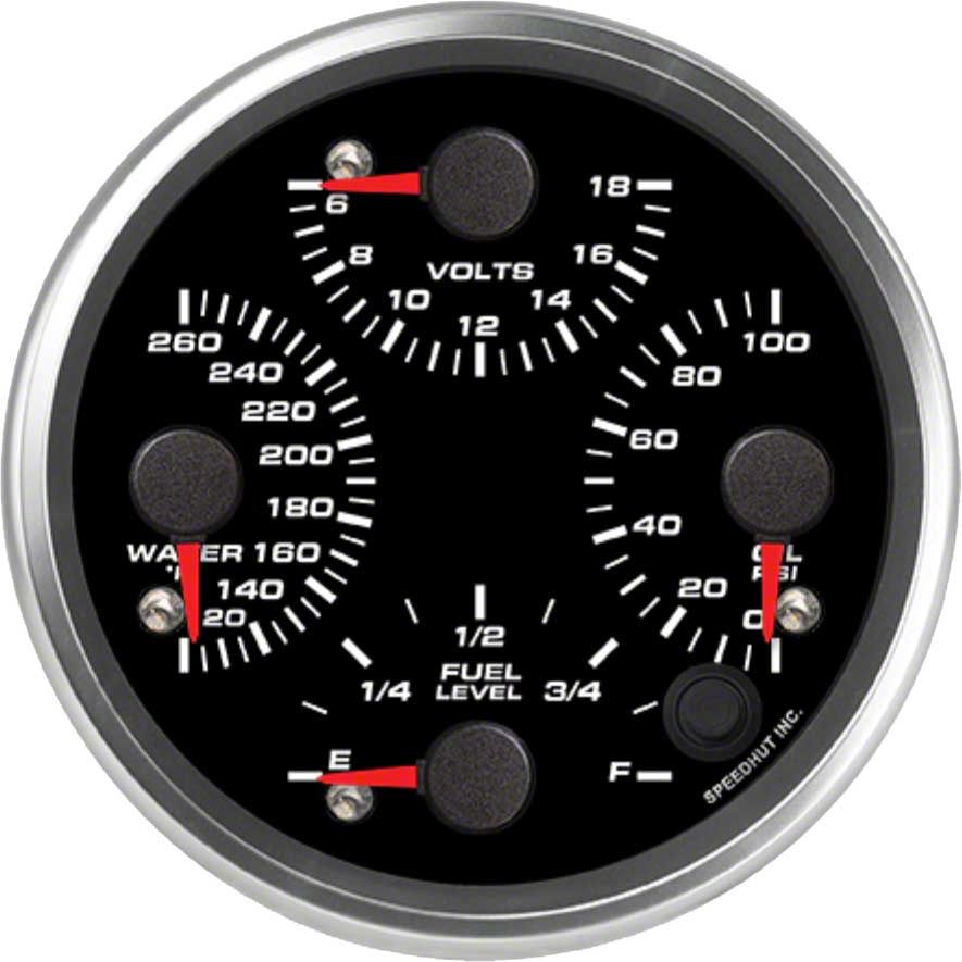 Speedhut Revolution Series 4-Inch Quad Gauge; Fuel Level; Oil Pressure 0-100 PSI; Water Temperature 120-260 Degrees Fahrenheit; 6-18 Volts (Universal; Some Adaptation May Be Required)