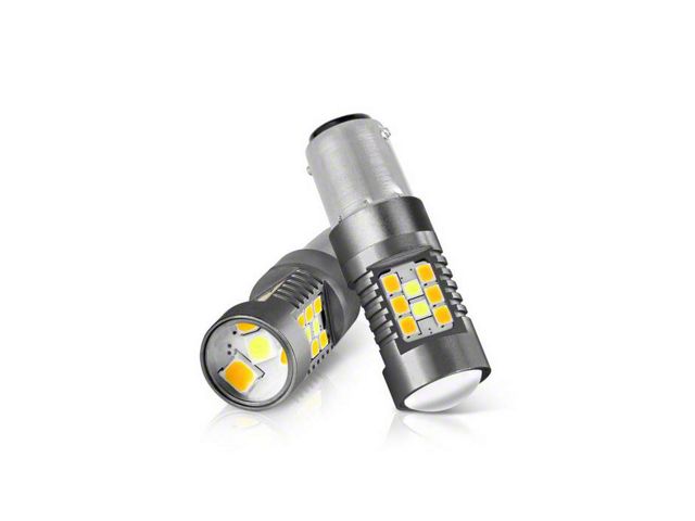 Lighting Specifications. The bulbs feature 21 side and 7 center LEDs soldered into the bulb to provide 360-degree coverage. The lighting is optimized for JMD 2000K yellow light (from 21x 2835 LED) and 6000K cool white light (from the 3030 LEDs). The bulbs are programmable to switch between white and yellow light. These bulbs use 1157/BAY15D sockets for universal, cross-model fitment.