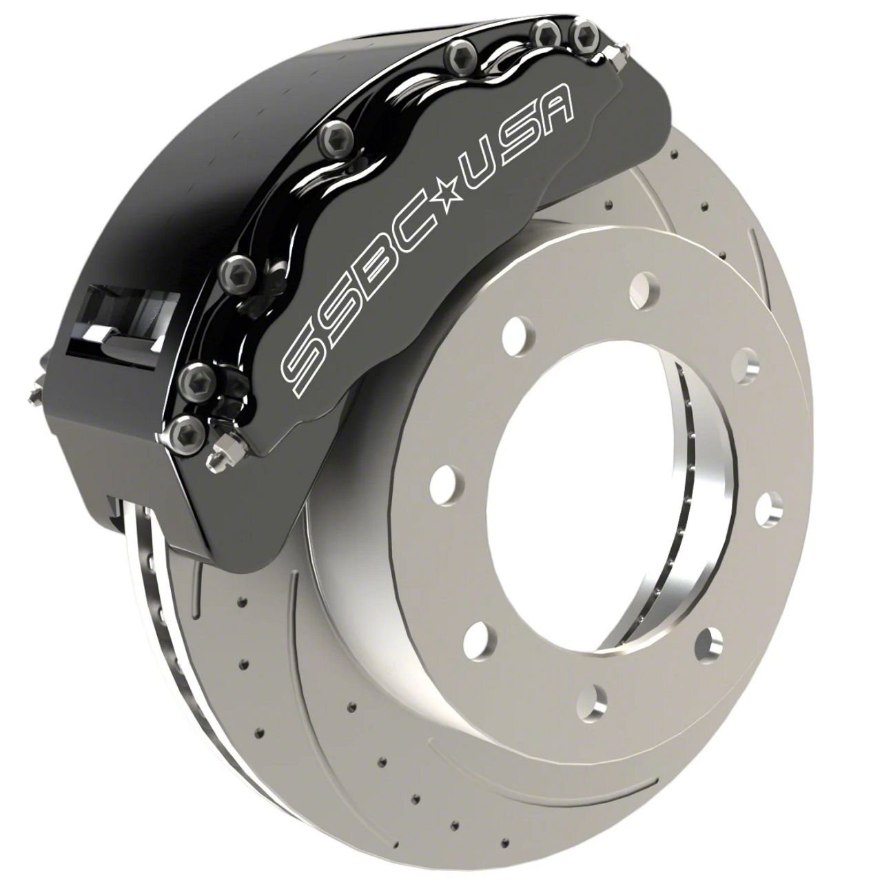 The 8-piston aluminum calipers are a direct replacement for factory 2-piston front calipers. The SSBC-USA kit includes high-performance severe-duty brake pads, all necessary hardware and full instructions. Standard colors are clear anodized, red, and black, with optional custom powder coat colors available.