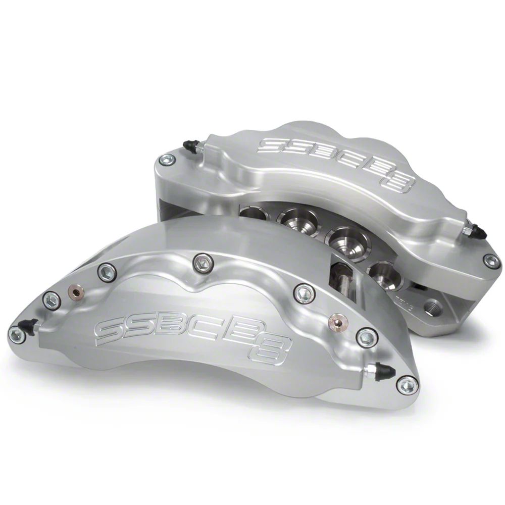 The 8-piston aluminum calipers are a direct replacement for factory 2-piston front calipers. The SSBC-USA kit includes high-performance severe-duty brake pads, all necessary hardware and full instructions. Standard colors are clear anodized, red, and black, with optional custom powder coat colors available.