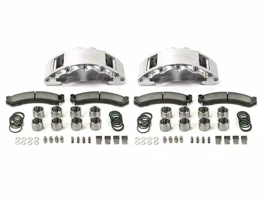 SSBC-USA Barbarian Front 8-Piston Direct Fit Caliper and Semi-Metallic Brake Pad Upgrade Kit with Dimple Drilled/Slotted Rotors; Clear Anodized Calipers (20-26 Silverado 3500 HD)Find parts that fit my vehicle
