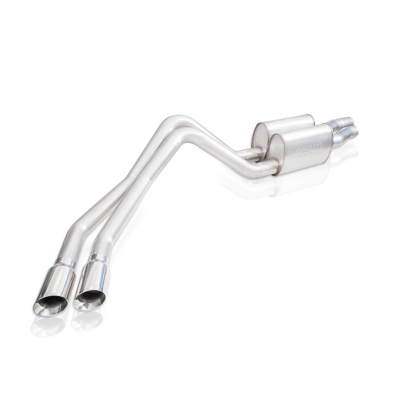 This system features dual mufflers and dual 4" polished slash-cut double wall tips. Options to connect to either the stock manifolds or Stainless Works headers. Exits out at factory location behind rear tire.