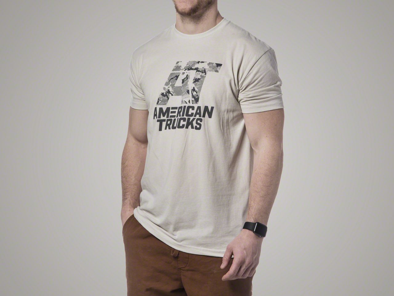 Available in Men's Sizes. This light tan AmericanTrucks Stealth Graphic T-shirt is available in a variety of men's sizes and is designed in an athletic fit. Please select your size from the ordering options above. (For a looser fit, order one size up).