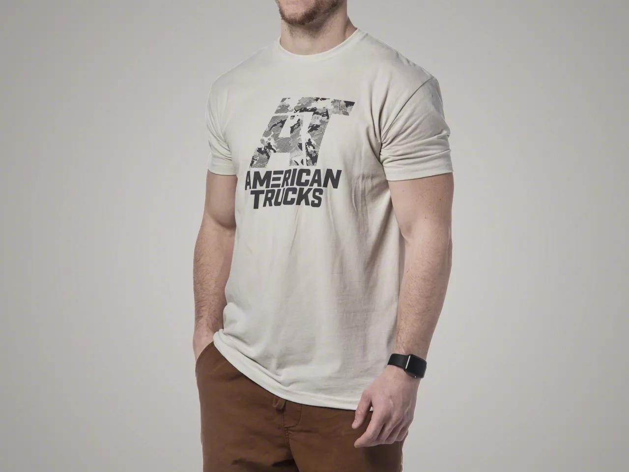 AT Stealth Tee. Featuring the AT Logo front and center, in a stylized camouflage design, this great looking light tan T-shirt is a must have for all Truck enthusiasts. This men's short sleeve T-shirt is the ideal piece of active wear for hot days and warm nights.