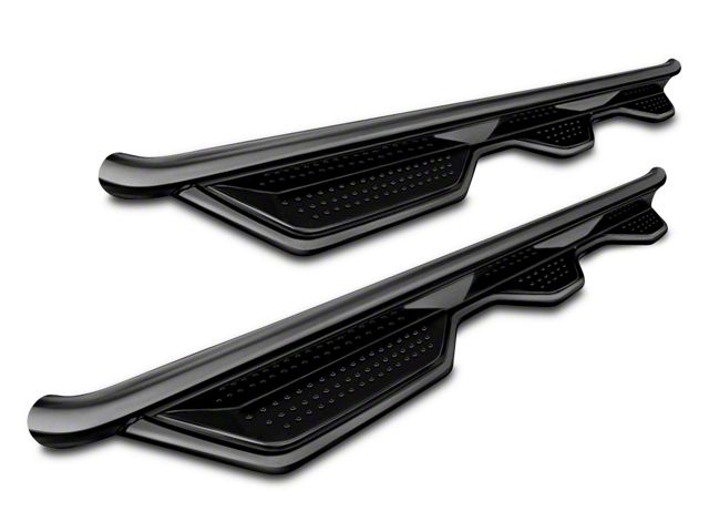 Unique Step Design with Highly Functional Traits. With a distinctive style of space-age ruggedness that will really make your 2009-2018 Ram 1500 look professionally customized, these HD Wheel to Wheel Side Step Bars, Black offer very large step areas for safe and easy ingress to and egress from the cab. The step pads are punched plate steel, reversed so that the punched edges stick up to provide plenty of “bite” for shoes or boots to cling to even in thick mud, snow, or rain. Extending all the way from wheel to wheel to shield against road debris, the bars have three pads on each side – two for the doors and a third, close to the rear tire, serving as a side bed step.