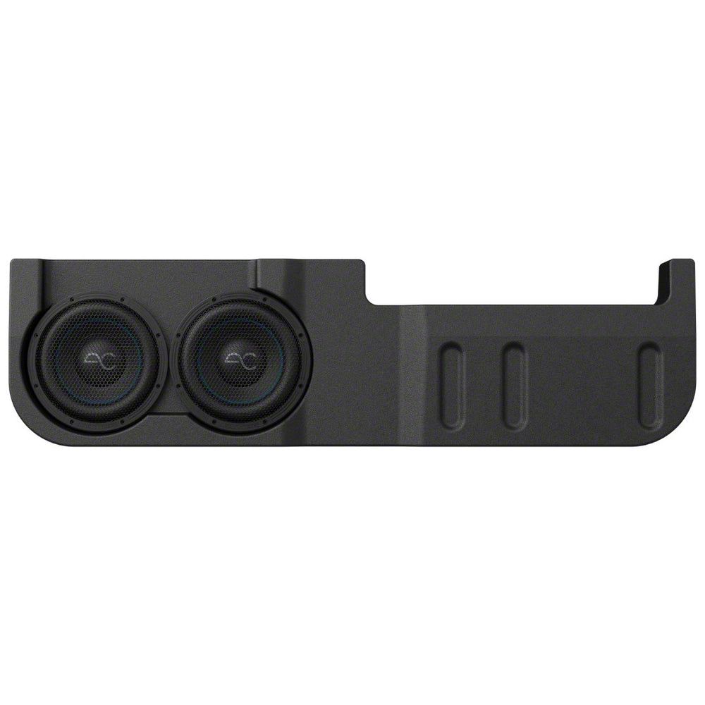 OEM-Style Bass Upgrade Solution. The Stinger Electronics Underseat Dual 10-Inch Subwoofer Enclosure provides an ideal solution for adding deep, powerful bass to your 2019-2026 GMC Sierra 1500 Crew Cab without sacrificing interior space. Designed to fit seamlessly beneath the rear seat, the Stinger enclosure maintains a factory appearance while delivering enhanced audio performance. It is perfect for audio enthusiasts who want an integrated and powerful upgrade.